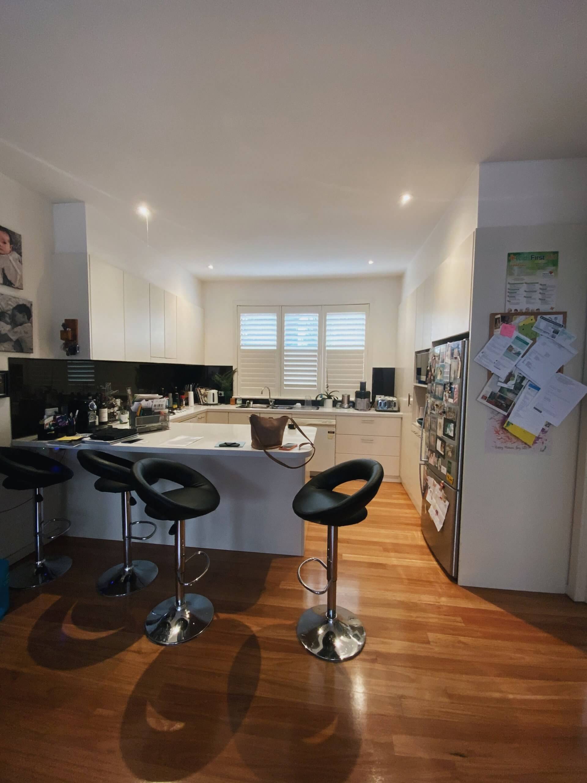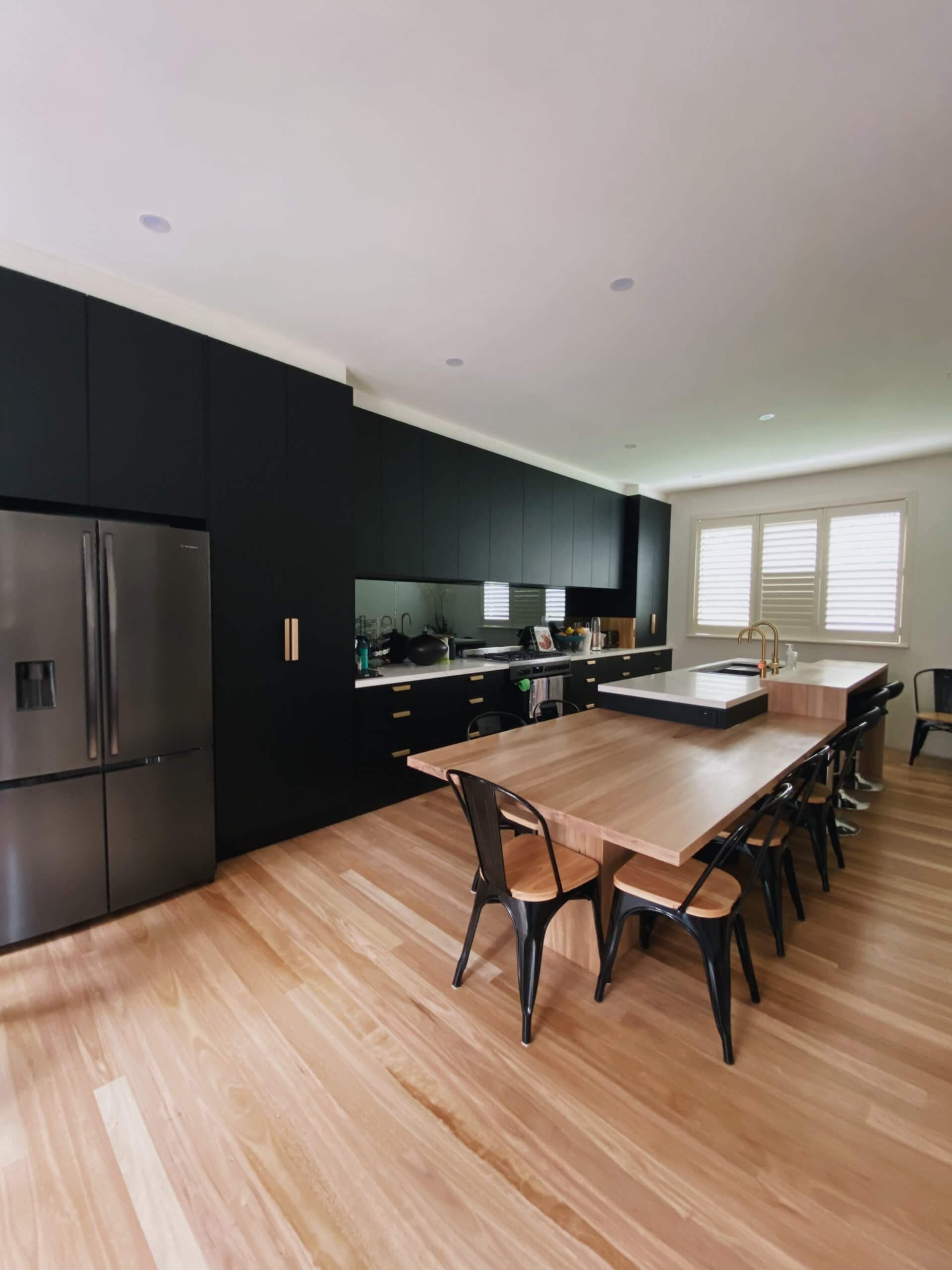 Extending the kitchen into the rest of the room took this confined kitchen to an entertainers dream. The large island creates the perfect space for preparation and dining, with the timber feature bench creating a show stopping design. Paired with black cabinetry, brass fixtures and natural oiled timber flooring, this kitchen is an excellent addition to the home.
